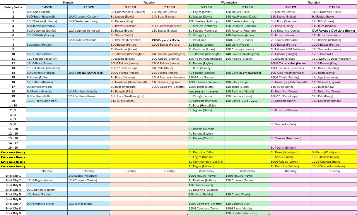 2026 PRACTICE SCHEDULE IS AS FOLLOWS:December 10, 2025 - January 8, 2026 | Practice twice per week anytime Monday - ThursdayJanuary 12, 2026 - February 26, 2026 | Practice one day per week anytime Monday - ThursdayOn the 1 day per week practice schedule use one of your designated days you were using on the 2 days per week schedule.Practice Time Slots will be from 1) 5:45 PM - 7:10 PM2) 7:15 PM - 8:45 PMPractice locations: Ocala Rotary Sportsplex & Brick City ParkROTARYROTARY SPORTSPLEX PRACTICE FIELDSBRICK CITY PARK PRACTICE FIELDS